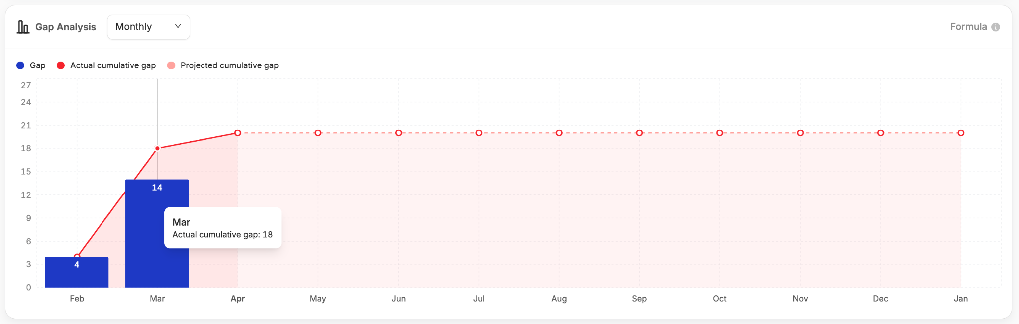 The gap analysis does not just show you where you are. It forecasts where you are going. Each month's unfilled positions roll forward into the next period. The model projects future hires based on your historical fill rate and, where available, your recruiter capacity. The result is a cumulative shortfall view that tells you — today — whether you are on pace to hit your annual hiring plan or whether you need to act now.